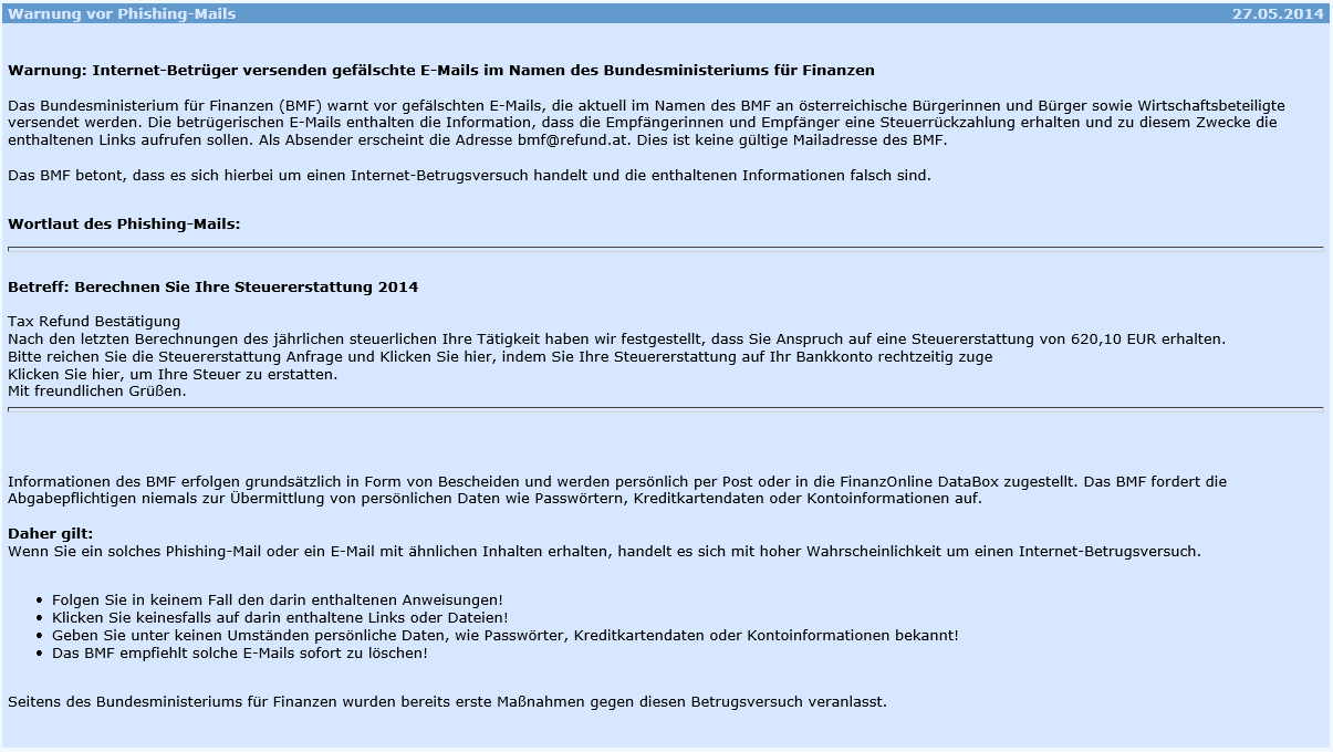 Das Finanzministerium hat folgende Info bereitgestellt und warnt vor gefälschten mails von Internet-Betrügern: